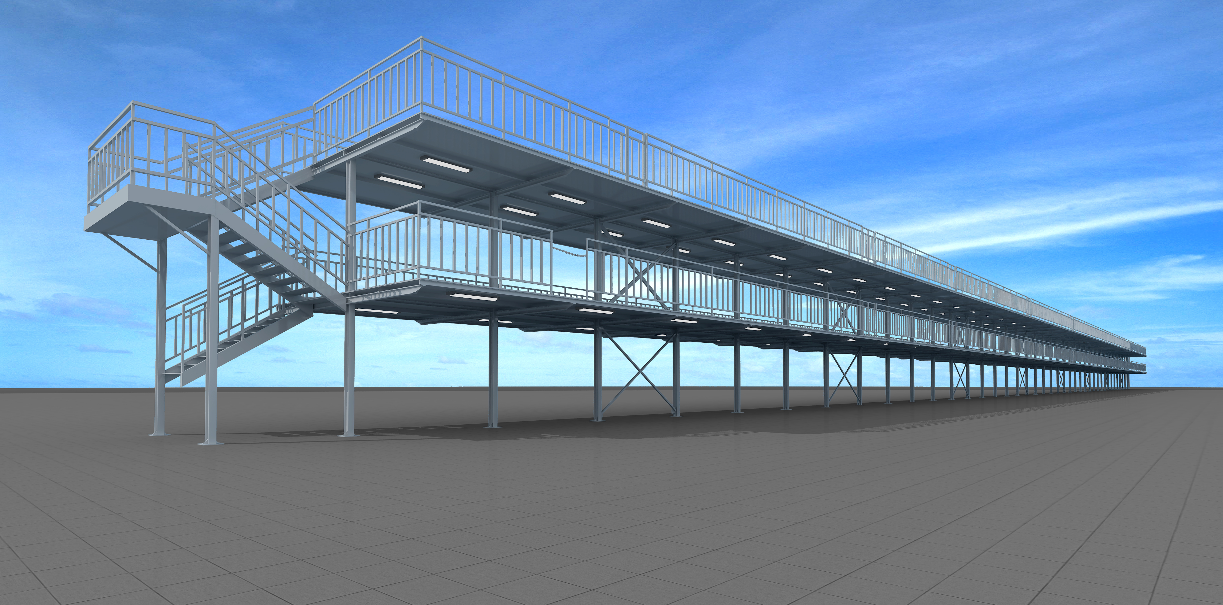 上圖為地鐵車輛段三層檢修作業平臺。采用全鋼結構,為地鐵車輛檢修、維護提供操作平臺。